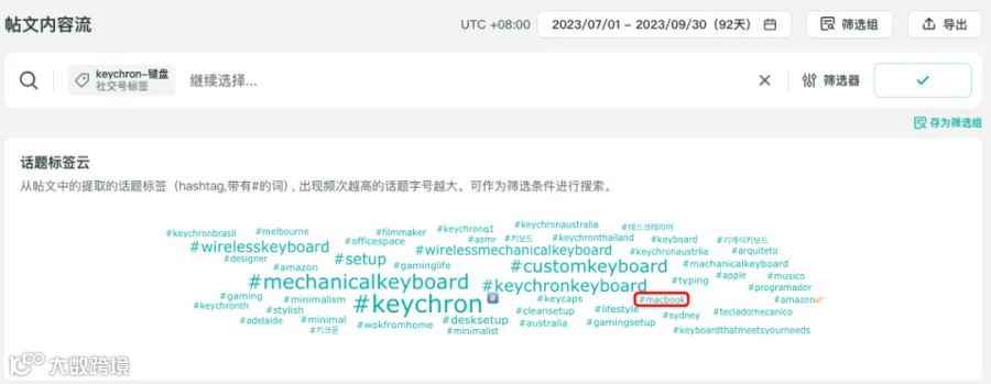 而从OneSight营销云的“帖文内容流”功能我们聚合查看了其第三季度常使用的话题标签,除了常见的品牌词#Keychron或者#蓝牙键盘、#自定义键盘、#机械键盘等关键词外,Keychron也将#Macbook作为其主要使用的话题标签之一,以此来覆盖Mac系统的使用者。