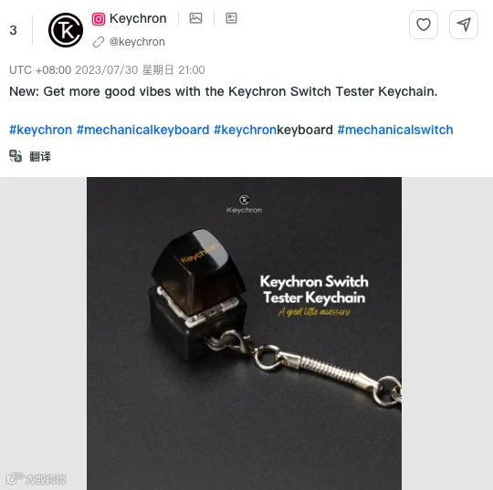 除了语言上的定制化,Keychron的客制化键盘本身也是品牌为消费者提供的个性化产品。另外我们还发现,除了主营的键盘产品之外,Keychron还会推出“解压按键钥匙扣”这类增加品牌存在感以及消费者使用趣味的衍生产品——通过单个可以按压的按键钥匙扣来帮助消费者时时刻刻体验使用机械键盘时放松舒适的体验。这一产品的相关内容也成为其Q3最受欢迎的帖子之一。