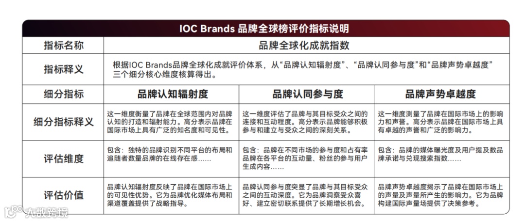 “IOC Brands品牌全球榜”启用了以国信品牌评价院BAQ模型为基础、引入国际标准和数据认证的独家评价模型——“品牌全球化成就指数”模型。 在该模型中,品牌在海外社交媒体平台上的行动及成就所产生的实际数据是一个重要的指标来源。