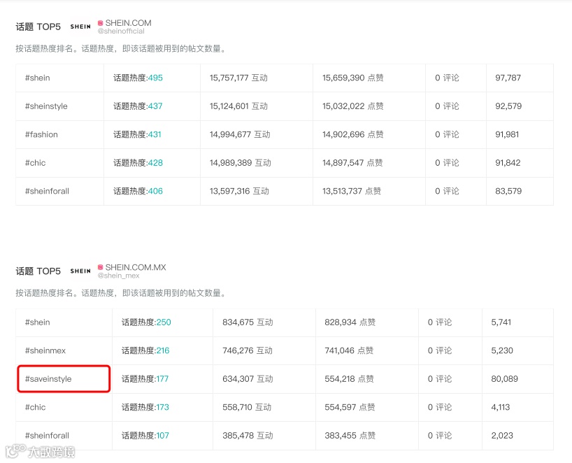SHEIN的全球页面常用话题标签为#shein、#sheinstyle等品牌词,以及#fashion、#chic等快时尚词汇。而在墨西哥页面,SHEIN还使用了#saveinstyle(节约风)来吸引既追求时尚又希望省钱的消费者。
