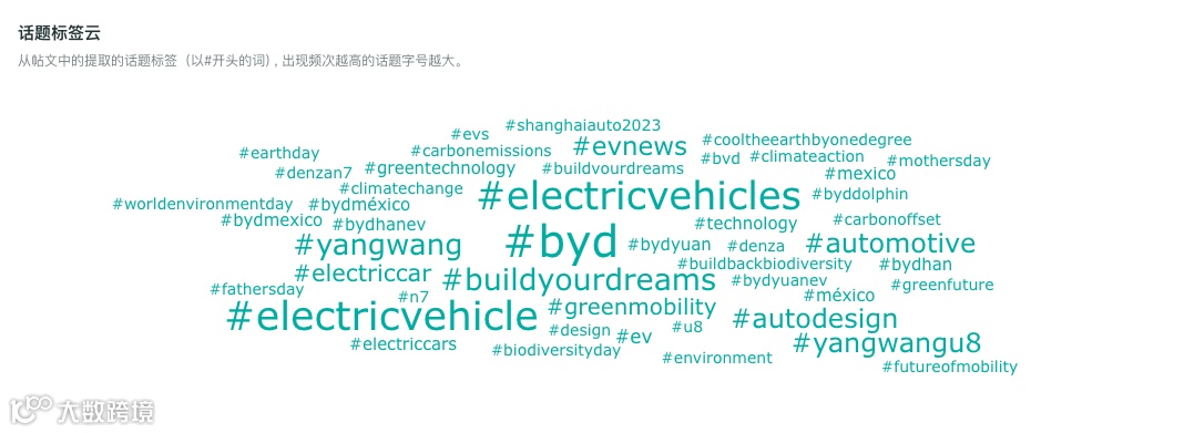 通过OneSight营销云的“社交号监控”功能,我们可以观察到比亚迪粉丝数最高的Facebook全球页在Q2使用最频繁的话题标签。除了品牌词#byd、车型词#yangwang和#yagnwangu8外,与环保相关的#carbonemissions(碳排放)、#greenmobility(绿色出行)等都是比亚迪在主页中使用的高频词。