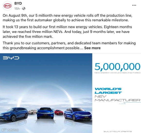 图片来自:BYD官方Facebook主页