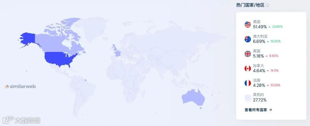 这一点从其网站的流量主要来源地也可以看出来。美国、澳大利亚、加拿大、英国、法国是其核心受众的主要来源地。