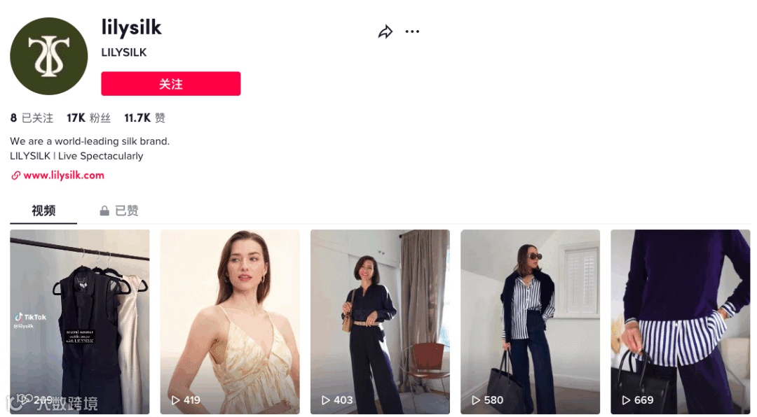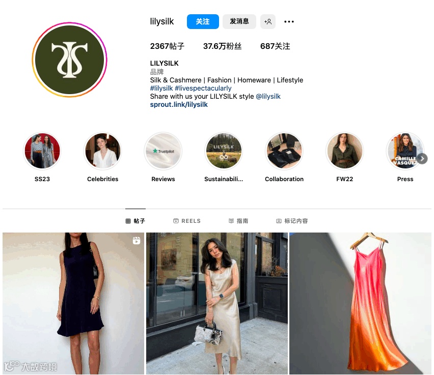 围绕真丝产品,LilySilk不论是在Instagram还是TikTok上都以“优雅、舒适、知性和自然”等关键词展开内容设置,打开其社媒主页,品牌一致性保持地非常好。