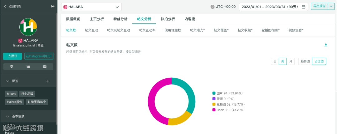 在Instagram上,Halara的全球页拥有196.2万粉丝。在刚刚过去的Q1,该主页的周平均发帖量为19.79帖,发布类型占比最多的是更容易获得Instagram推荐、也更适合展示服饰穿搭效果的Reels视频。
