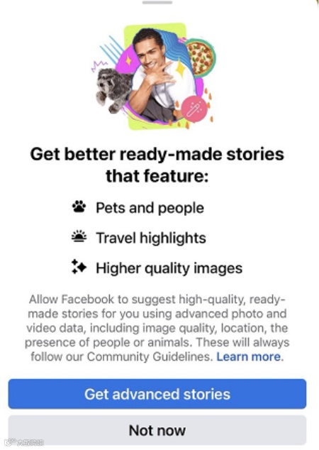 Facebook正在探索使用图像识别AI从用户已分享的内容中创建新的Stories。这项功能被称为“高级Stories”,它可以根据用户上传到应用程序中的图像生成新的Stories,并使用主题匹配提供模板框架,用户可以与他们的粉丝分享这些由AI生成的内容。