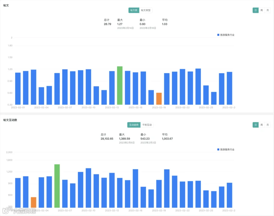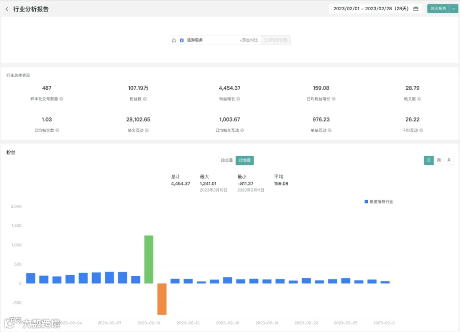 通过OneSight营销云“报告”模块的“行业分析”功能,我们能够轻松获得旅游服务行业的社媒运营表现数据。数据涵盖行业总体表现、粉丝、帖文、帖文互动数、行业热门帖文、行业热门话题等: