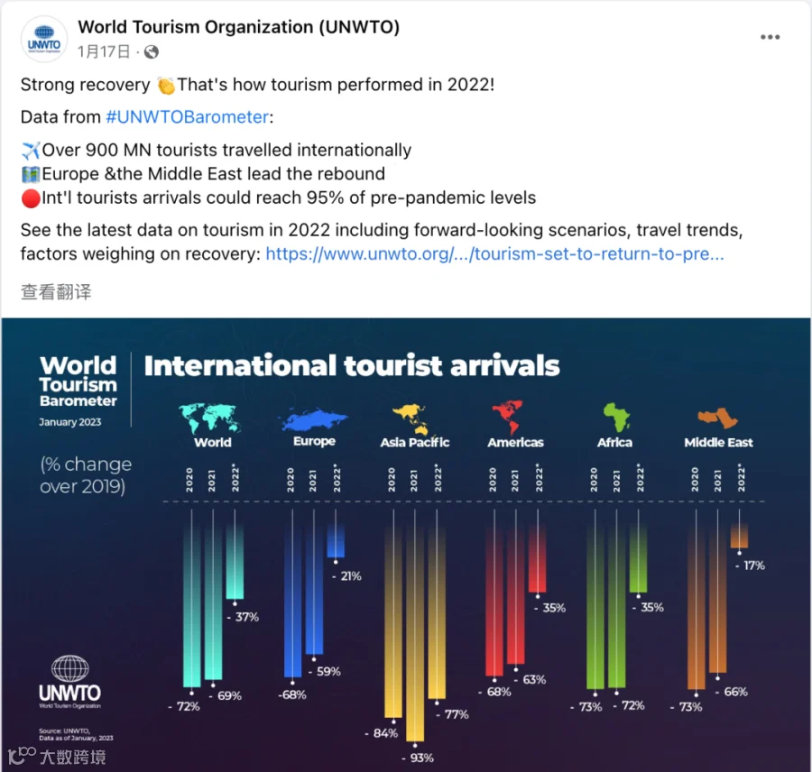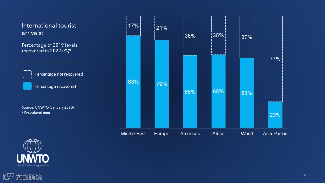2023年第一份联合国世界旅游组织世界旅游晴雨表还按地区分析了表现,中东与欧洲复苏最为强劲: