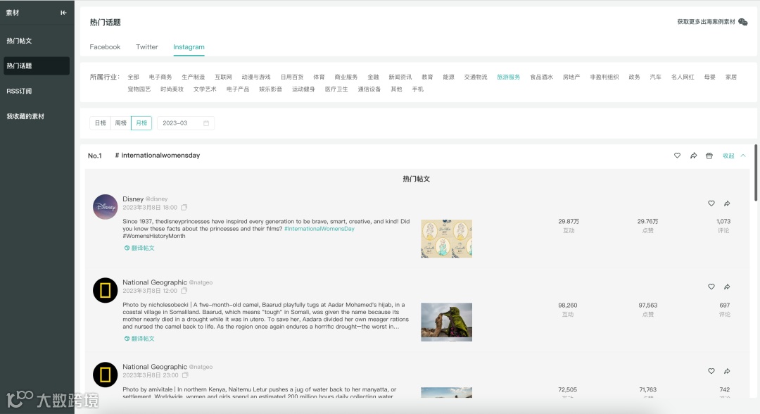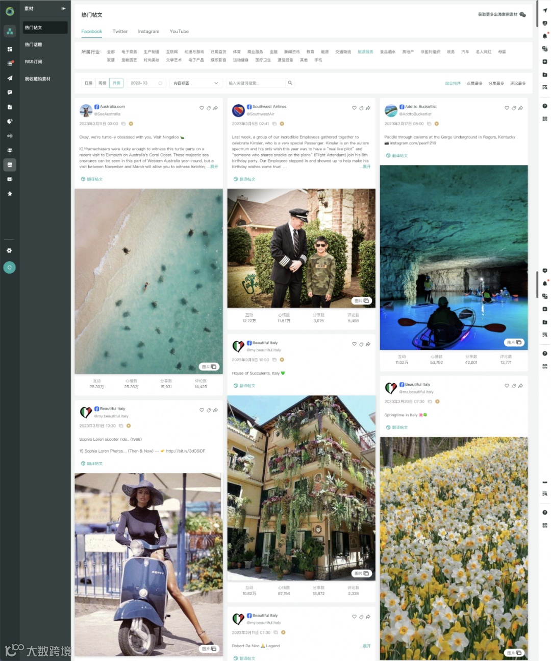 前往OneSight营销云“素材”模块的“热门帖文”页面,可以按不同的时间、排序查看Facebook、Twitter、Instagram及YouTube上旅游服务行业的热门帖文: