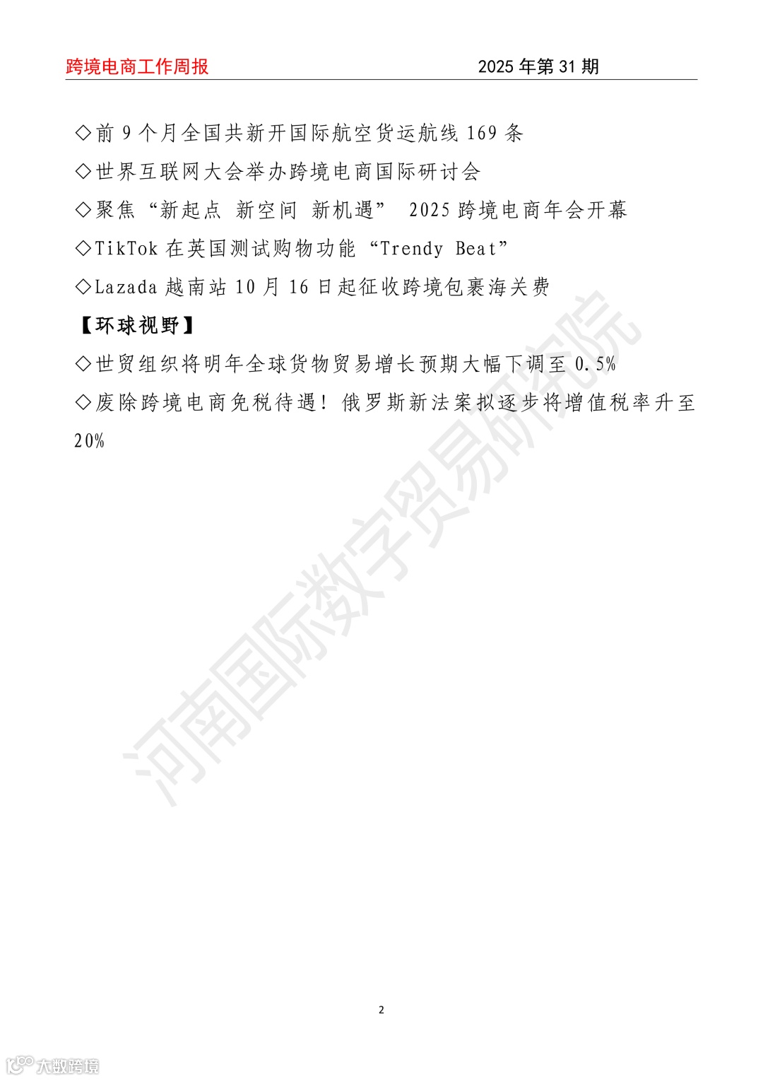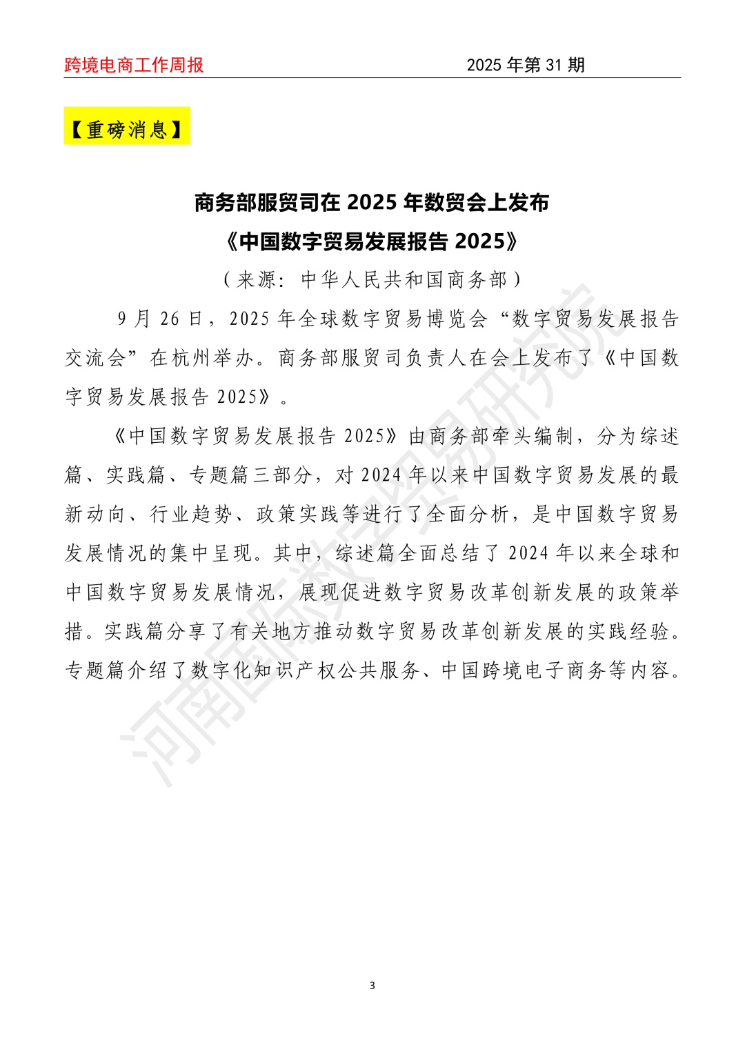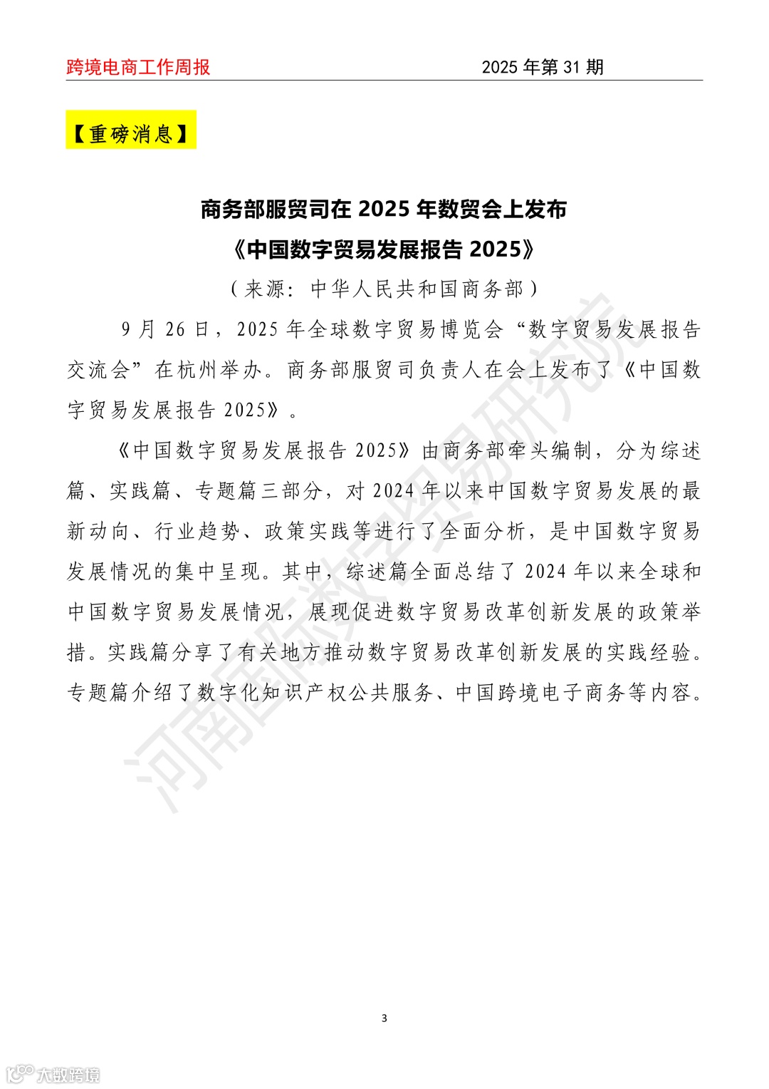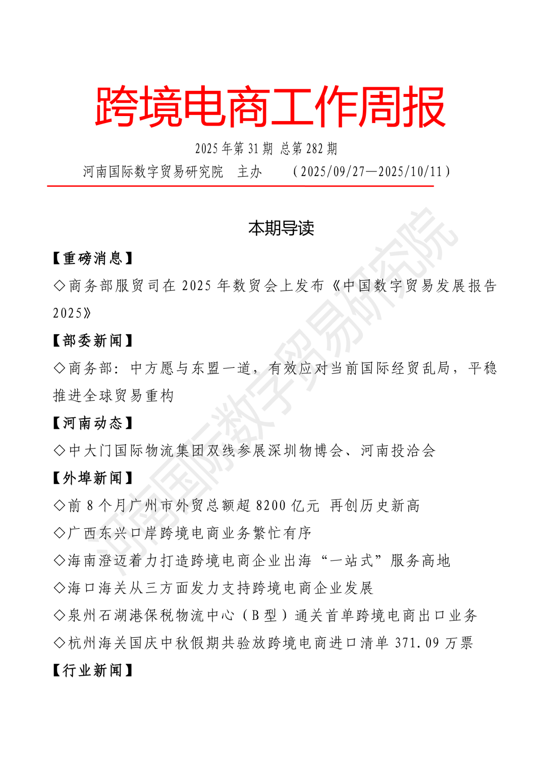 2025年第31期(2025/09/27—2025/10/11),跨境电商领域又发生了哪些事件,以下是河南国际数字贸易研究院为大家带来的本周外贸进出口、跨境电商平台、服务商及各地跨境电商最新动态回顾。