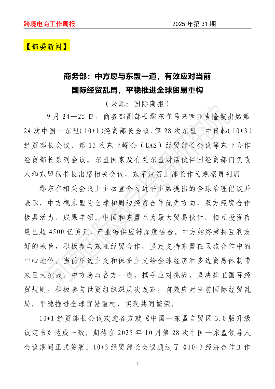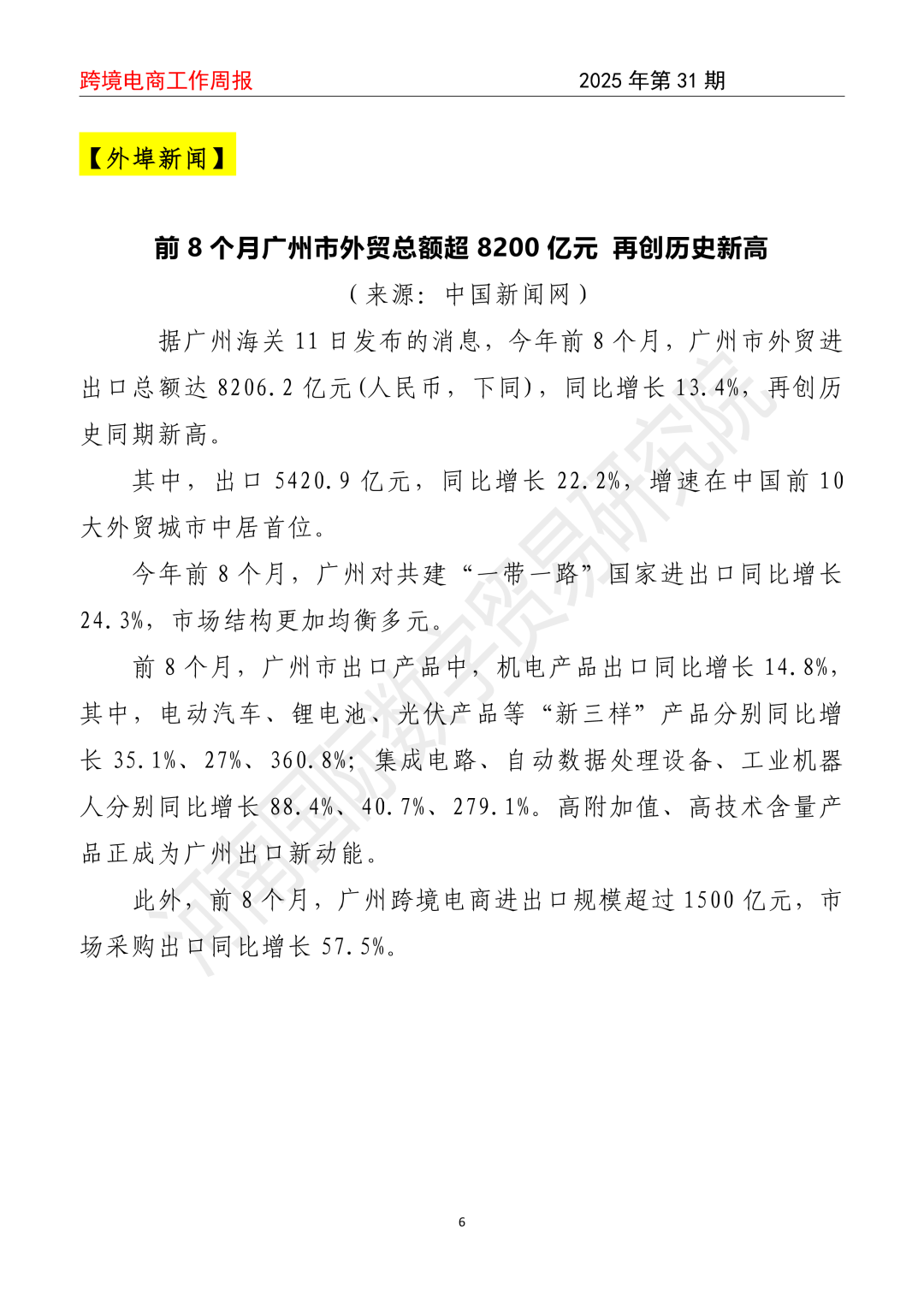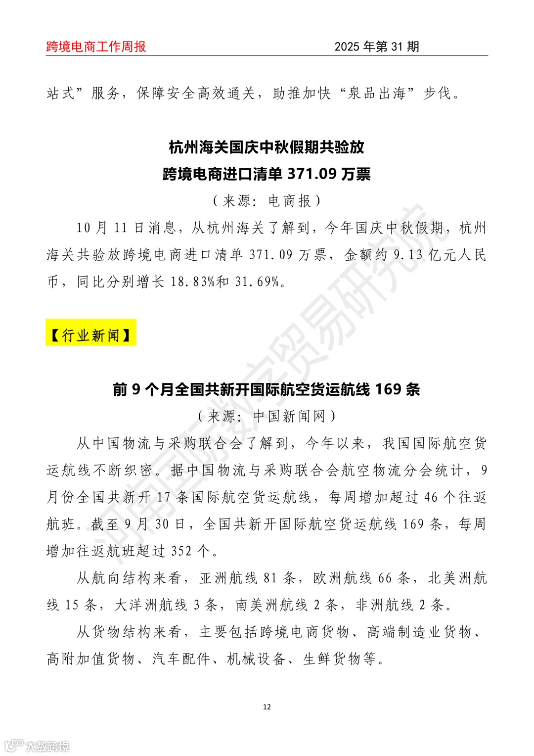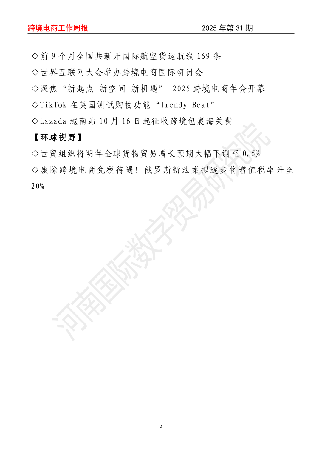 2025年第31期(2025/09/27—2025/10/11),跨境电商领域又发生了哪些事件,以下是河南国际数字贸易研究院为大家带来的本周外贸进出口、跨境电商平台、服务商及各地跨境电商最新动态回顾。