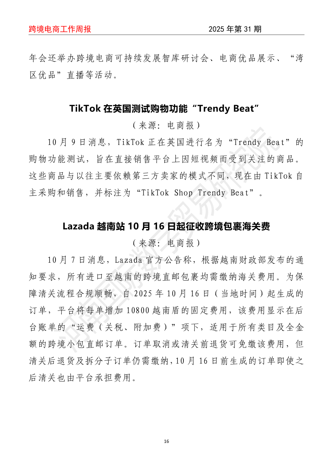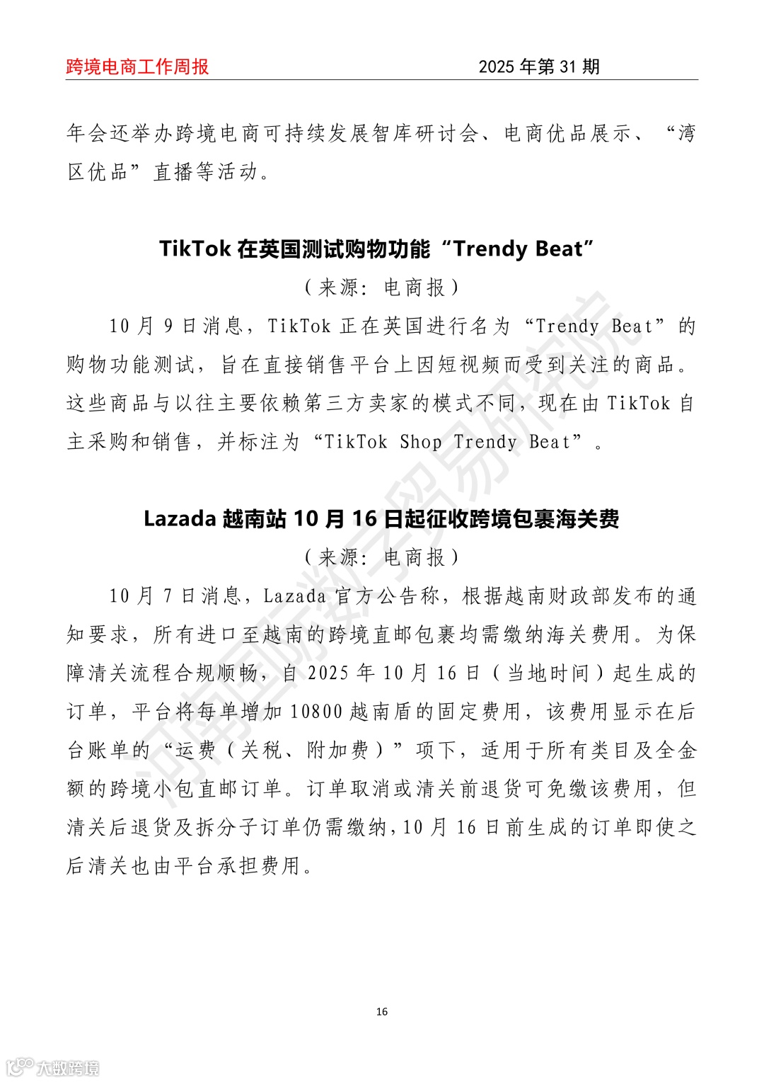 跨境行业活跃。世界互联网大会举办跨境电商国际研讨会。2025跨境电商年会(珠海-横琴)27日在广东珠海国际会展中心开幕。TikTok正在英国进行名为“Trendy Beat”的购物功能测试,旨在直接销售平台上因短视频而受到关注的商品。Lazada越南站10月16日起征收跨境包裹海关费。
