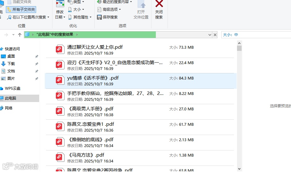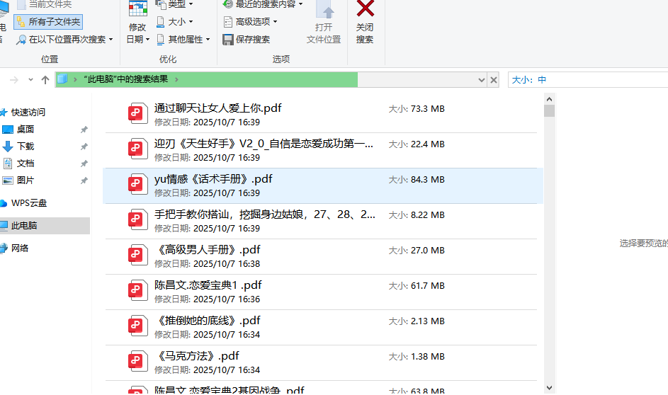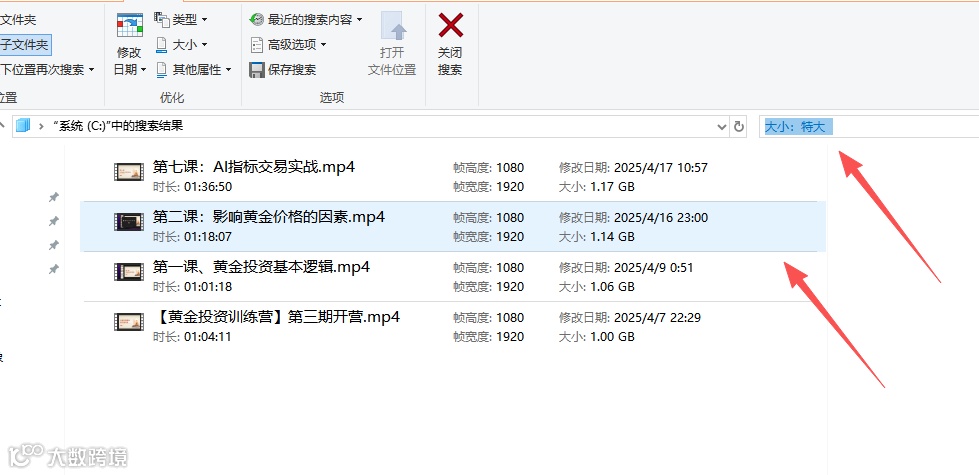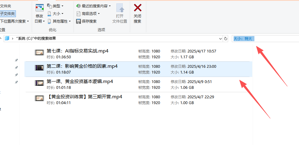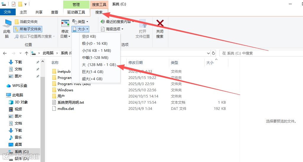 选择“大小”,然后从下拉列表中选择一个大小范围,例如“巨大(>128MB)”。系统会自动搜索C盘下所有大于128MB的文件。