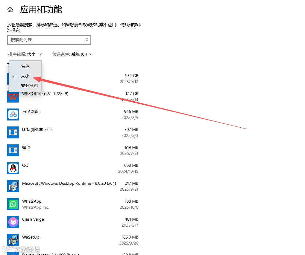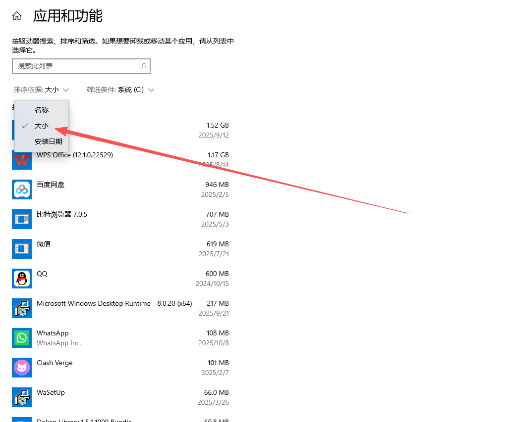 在空白处右键,选择“排序方式” -> “大小”,然后选择“递减”。这样最大的文件就会排在最前面。
