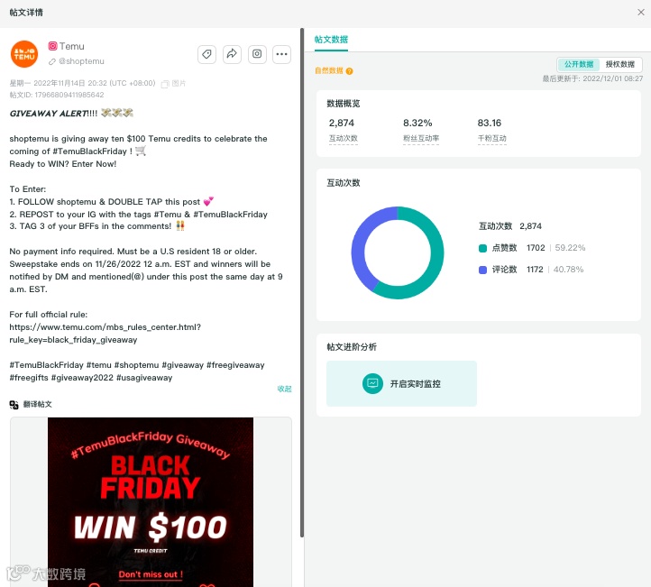本次Temu以高达90%的折扣在价格竞技场上拔得头筹。作为今年9月份才上线的电商品牌,Temu在海外社媒的流量明显不及SHEIN,但从其社媒运营策略上来看,其萌宠运营为主页赢得了不少流量与互动。本次黑五网一购物大促期间,Temu还通过在主页举办Giveaway活动为大促加热。