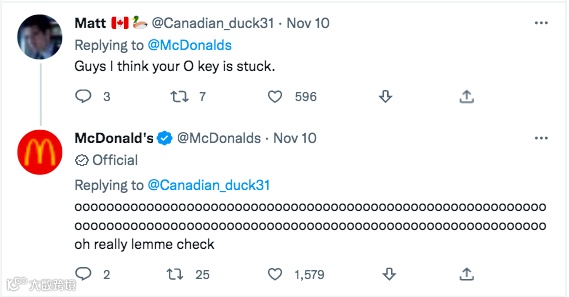 11月10日,麦当劳Twitter主页发布了一篇互动数达60w+的热门帖文。这是一篇“无厘头”纯文字的创意帖文,麦当劳发布超过200个“o”字母直接引发粉丝用户好奇和互动。