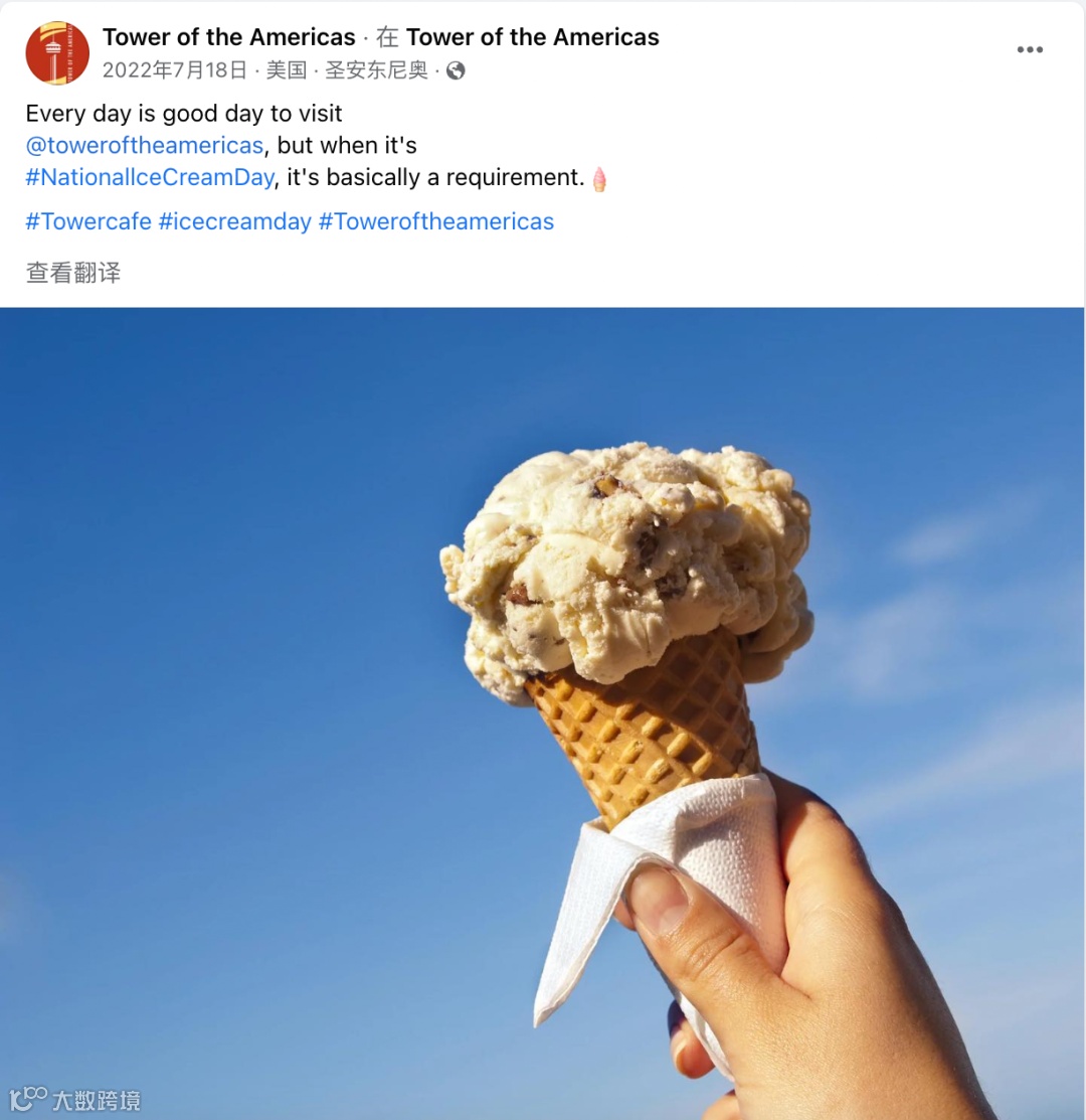 位于得克萨斯的Tower of the Americas(美洲之塔)发帖,在全国冰淇淋日来观光的话,手持一个冰淇淋是基本的: