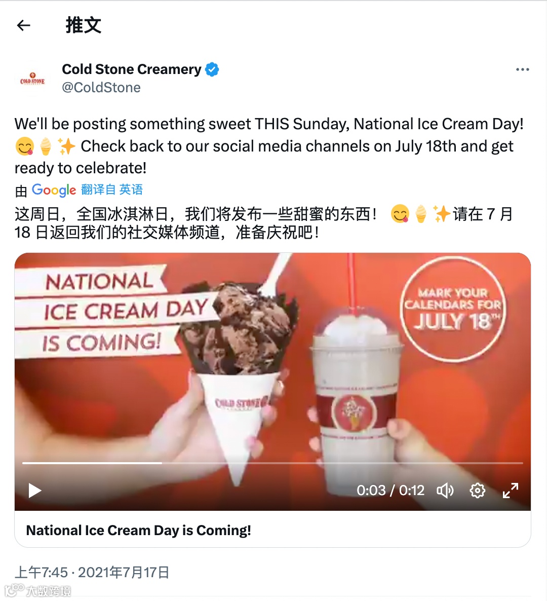 每年的6月和7月是北美地区大部分冰淇淋公司最繁忙的生产期。每到7月,美国人就开始了全民吃冰淇淋的狂欢,来庆祝这个属于冰淇淋的日子。很多品牌此时会在海外社媒上传播冰淇淋日带来的好心情,与大家同欢乐。