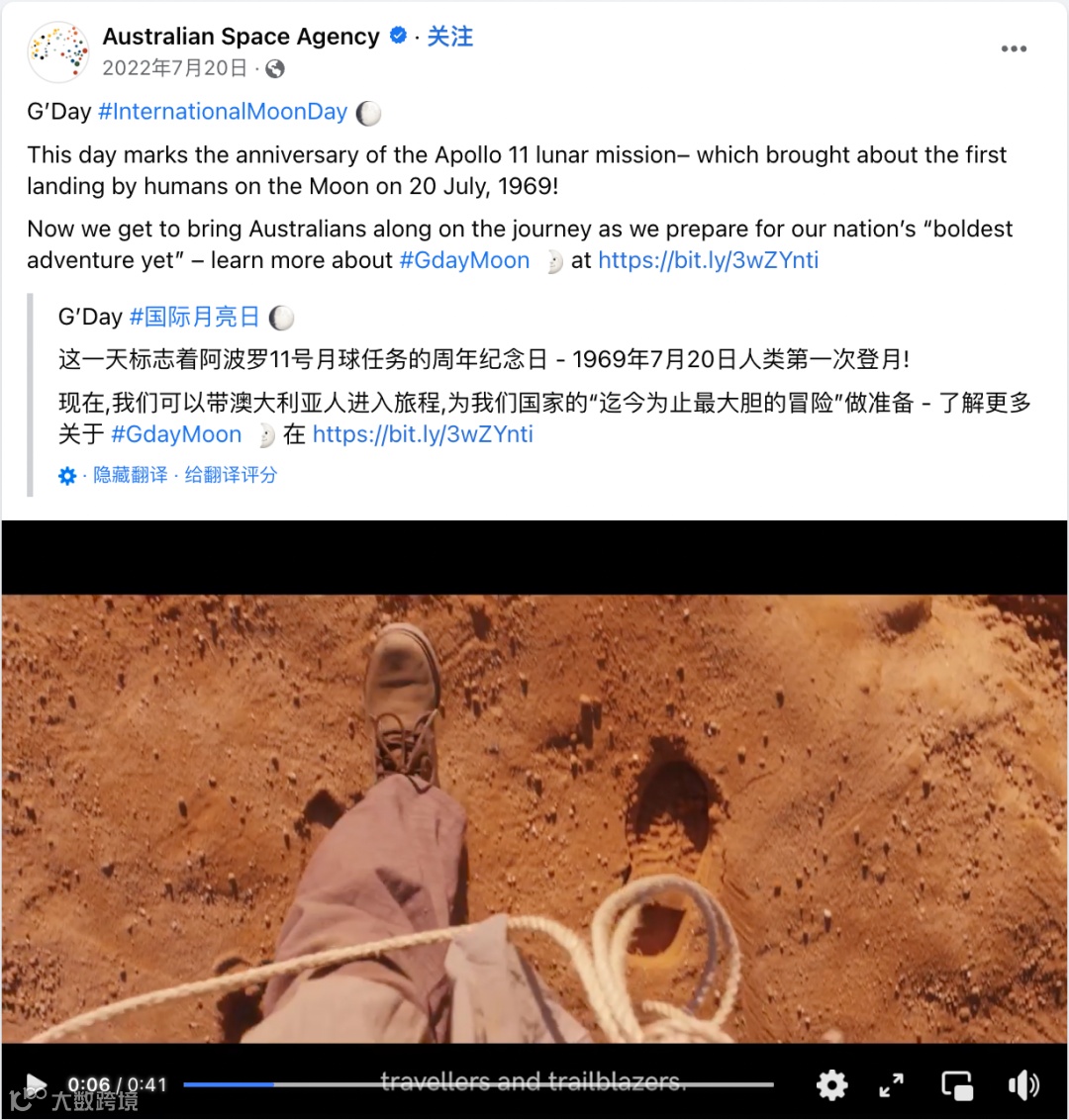 澳大利亚航天局的帖文用一个40秒短视频,以阿姆斯特朗踏上月球的一小步为创意灵感,带你踏上澳洲之旅: