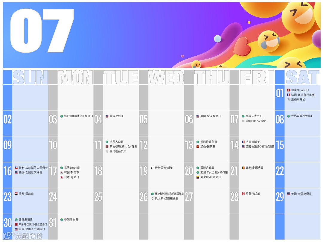 美国的全国冰淇淋月将为7月的夏日增添不少凉爽;即将开始的返校季意味着购物旺季的开启;一个简单的表情胜过千言万语,这是Emoji创造的沟通和表达方式;独特的“海之日”是夏日7月特有的馈赠;国际月球日也将在7月到来,它提醒我们,无论身处何处,总要有投向远方的目光和对未知世界的向往。