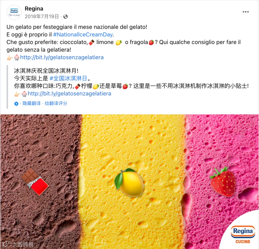Regina是一个意大利品牌,由跨国公司Sofidel于1987年创建,所生产的清洁用纸和家庭用薄棉纸在欧美畅销。他们的节日帖文用酷似冰淇淋的清洁海绵做创意,从而引发产品联想,并提供了不用冰淇淋机制作冰淇淋的小贴士: