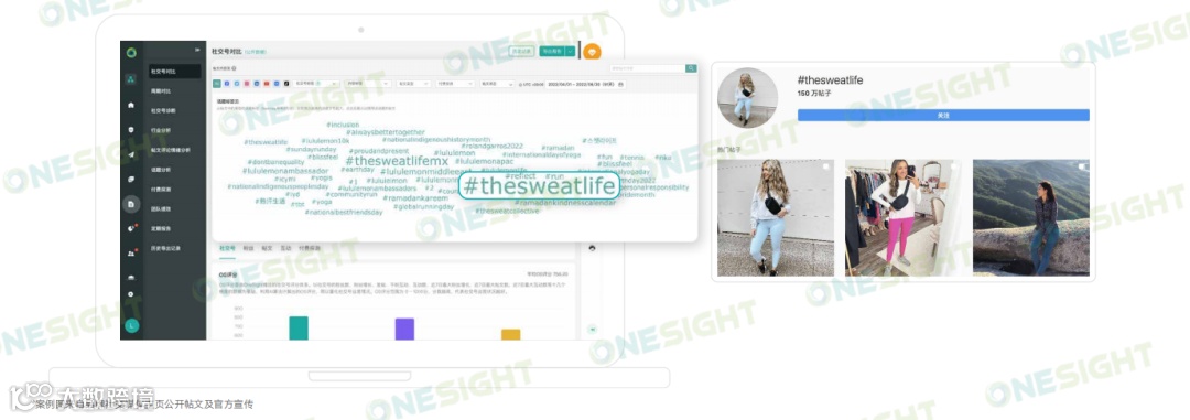 lululemon重视社媒平台上的UGC推广。通过OneSight营销云后台发现,在lululemon所有社媒账号中,最常使用的话题是#thesweatlife,该话题标签未使用品牌词,但时常出现在品牌的社媒账号上。通过线上与线下活动引导用户使用标签发布内容,产出众多热门用户生产内容。而消费者通过这类UGC与品牌产生连接,对品牌产生信赖感。