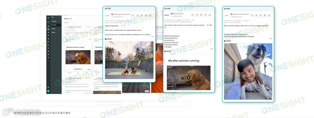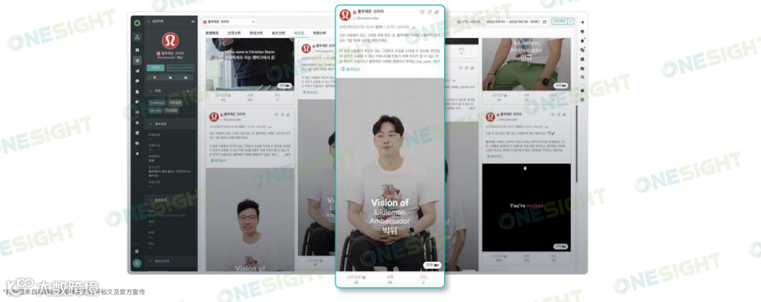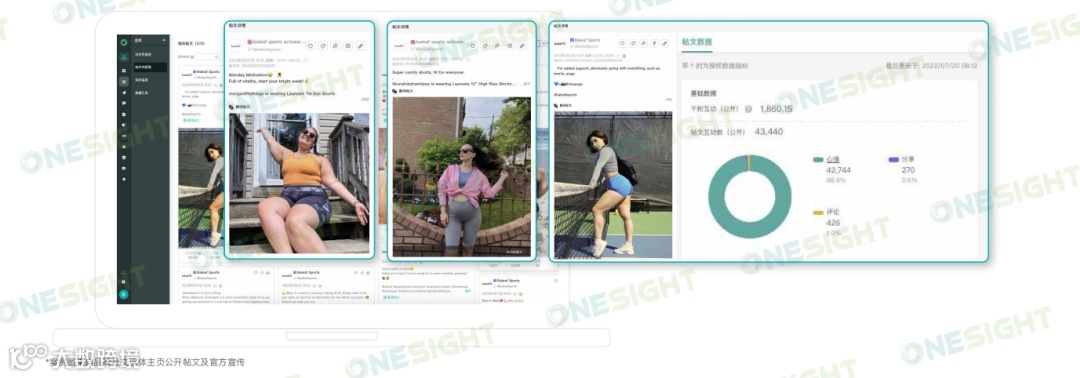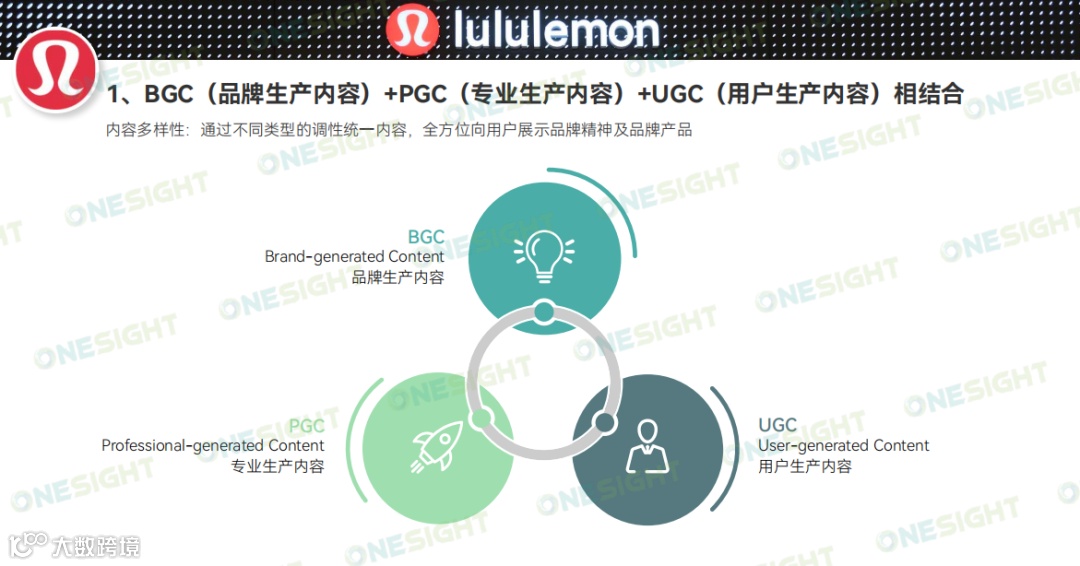 通过报告的研究OneSight发现,在今年的第二季度,lululemon在社交媒体上主要采取的是“BGC+PGC+UGC”相结合的融合战略,全方位向用户展示品牌精神及产品。