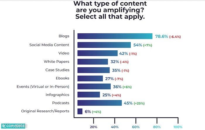 3.最容易被“放大”的内容类型是博客文章,其次是社交媒体内容