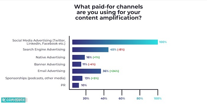 1.社交媒体成为B2B内容放大的核心渠道,所有受调查内容营销人员100%采用该渠道。