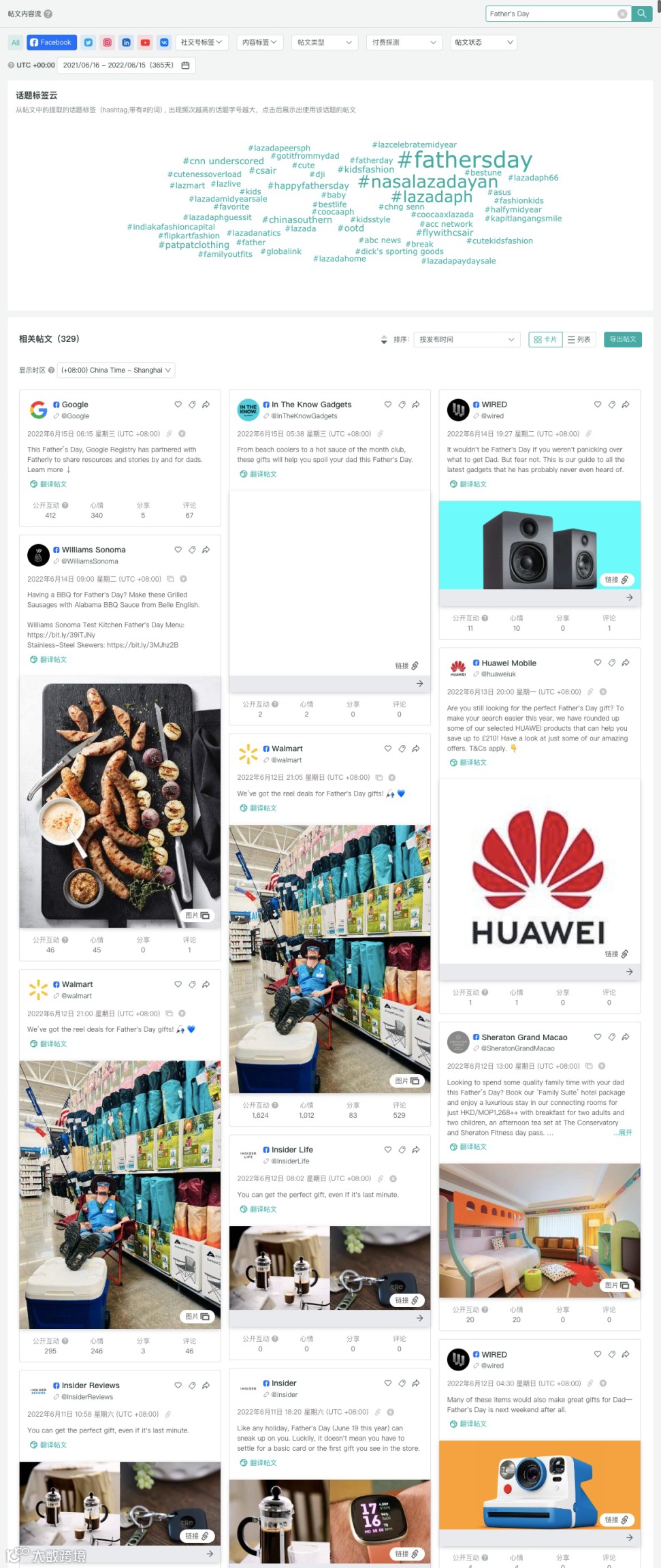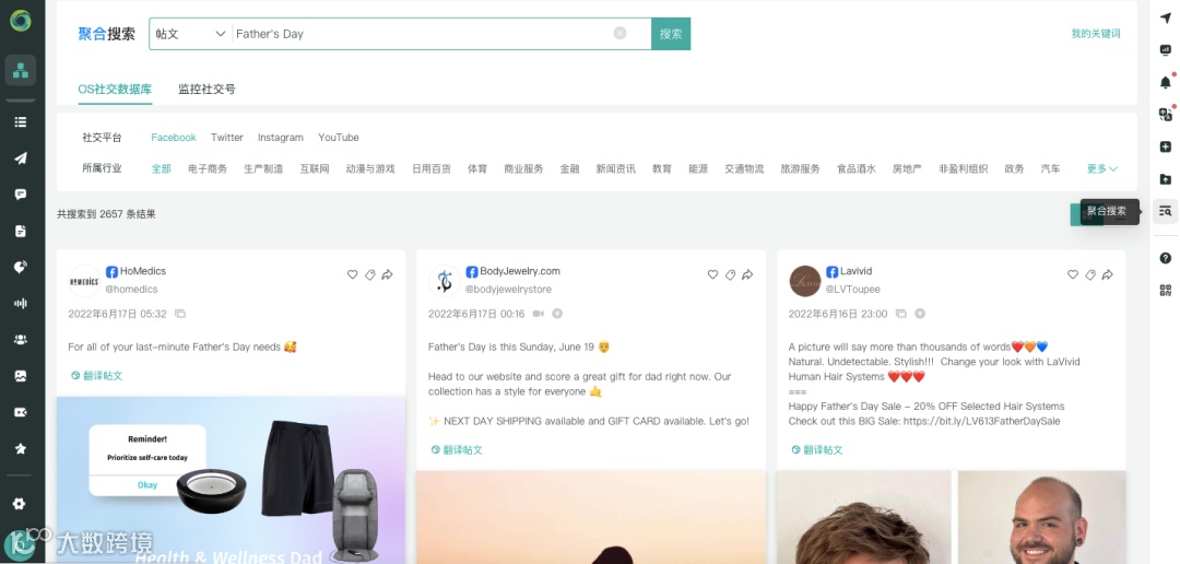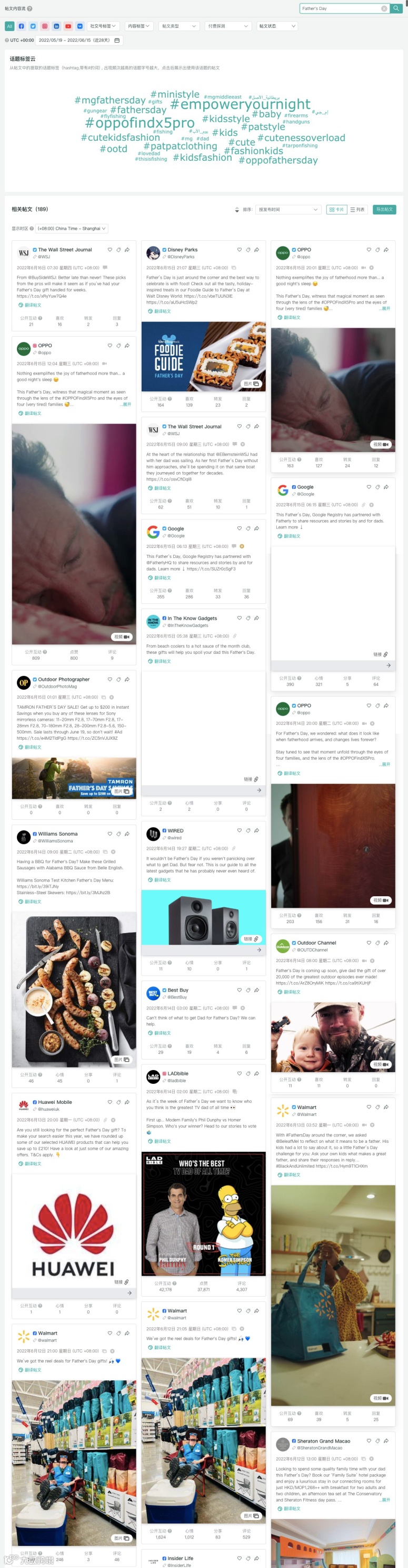 利用OneSight营销云,可以轻松查找你所需要的帖文内容,操作起来也十分简单。登录OneSight营销云后,点击“监控”模块的“帖文内容流”,在右上角的帖文内容搜索框内输入Father's Day,一次搜索,就可以找到多个平台上的相关帖文: