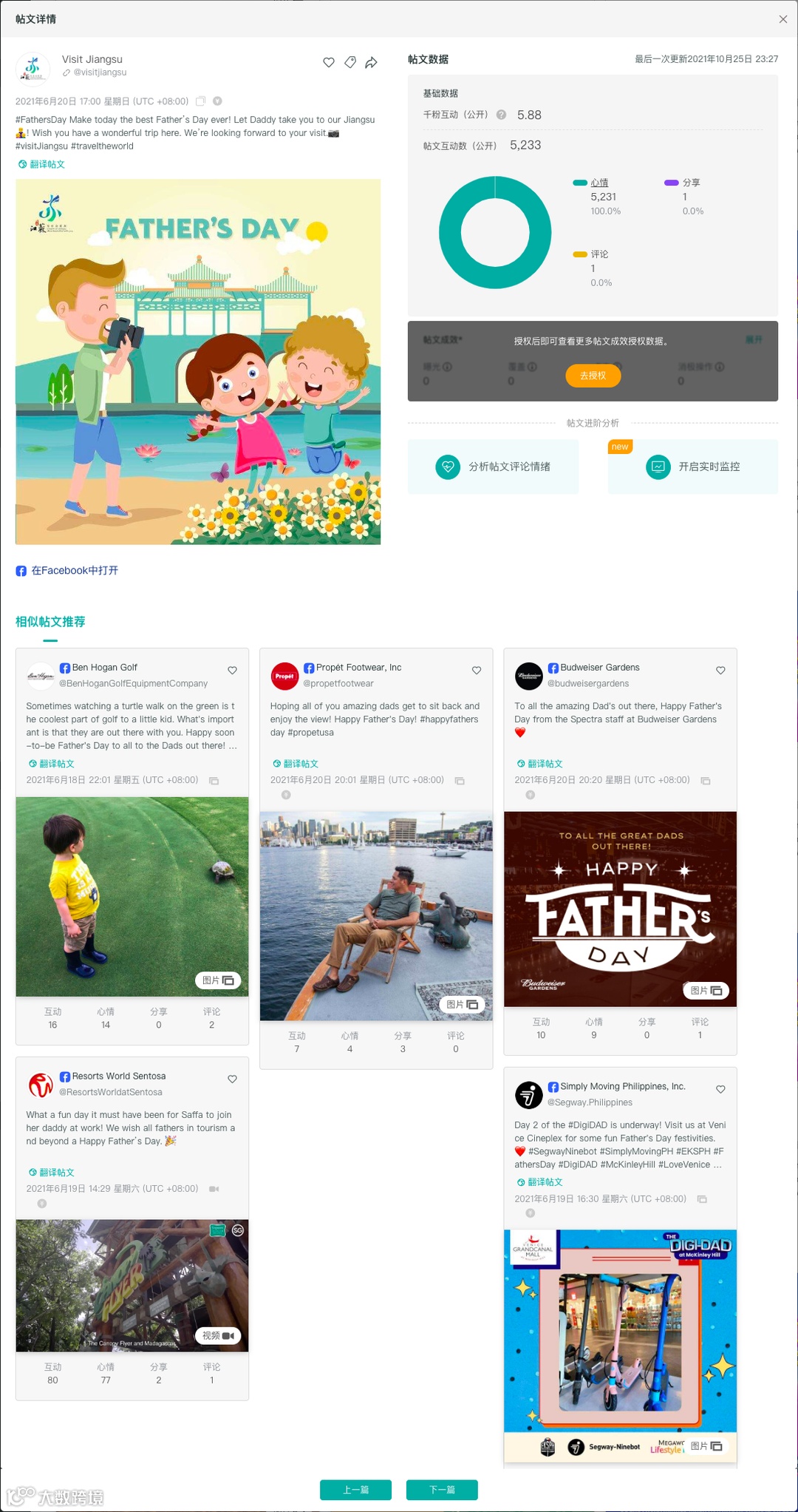 搜索结果更多是品牌主页的帖文内容,而这恰恰是你想要的。点开其中某个你所感兴趣的帖文后,你会发现能够得到更多——OneSight营销云在帖文详情页的下部提供了“相似帖文推荐”: