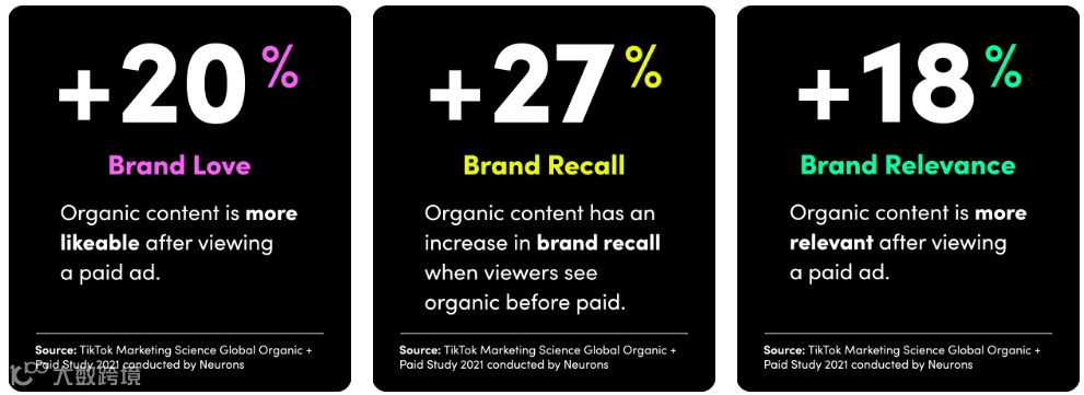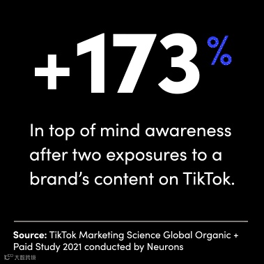 此外,研究表明,在TikTok上两次接触品牌内容后,用户对品牌的意识会显著提高。第一次是品牌原生内容,第二次是广告内容,加深广告的记忆度,也提升用户的参与度。