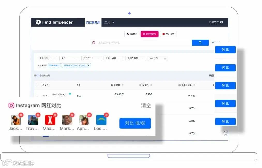 我们推荐使用能够进行红人筛选、红人数据洞察、单一红人深度洞察的全球社交媒体数据营销管理平台——OneSight营销云,来选择更适合自己品牌的红人/创作者进行合作。通过其中的“对比”和“数据”功能,来建立自己的合作红人库,为有效的合作营销提供储备。