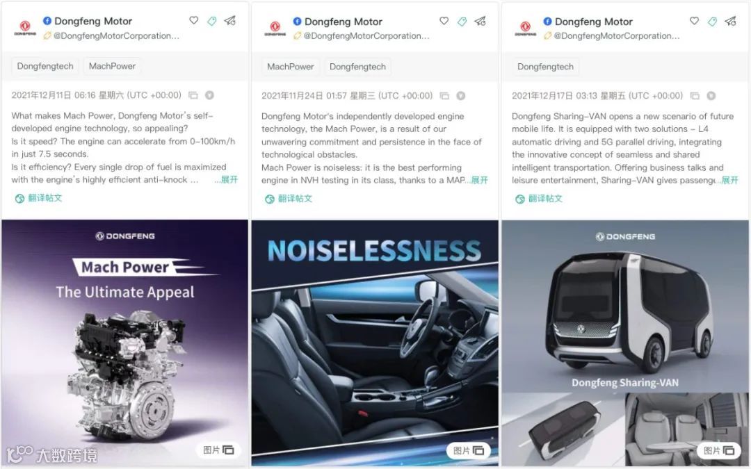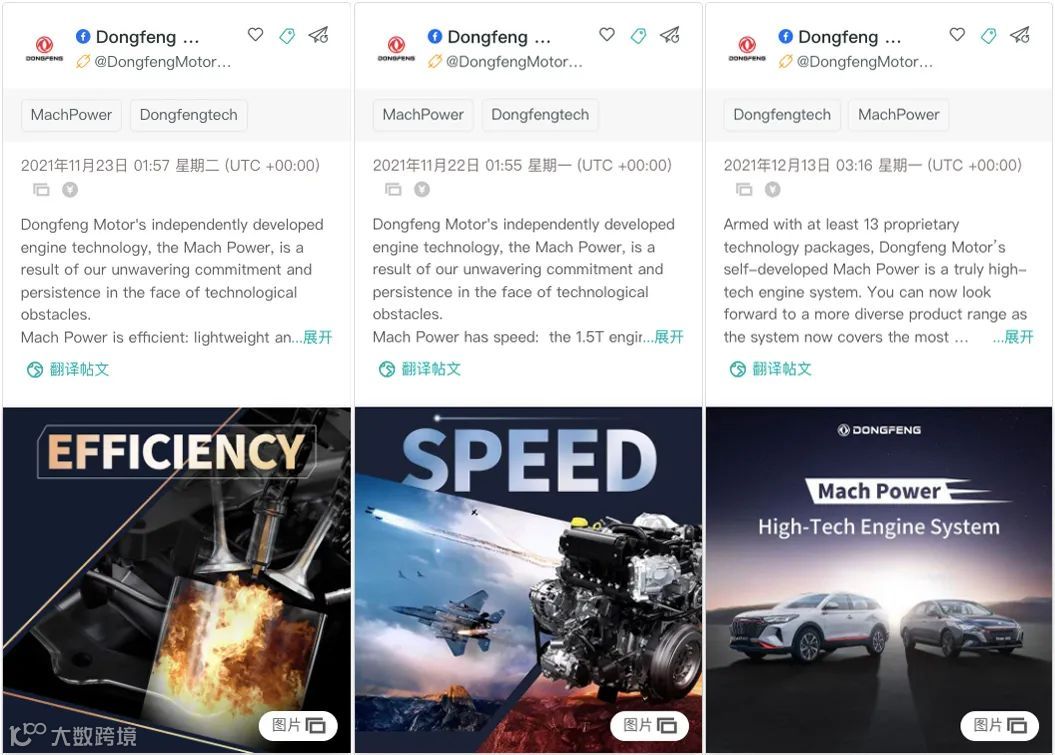 2021年东风汽车推出了自主研发的高科技发动机系统马赫动力Mach Power,主打节能减排,油耗低,以此为重点,在海外社媒上以#machpower为标签,通过Facebook平台大力宣传了发动机的优质性能,向世界展示了中国“智造”——自主研发的中国心。