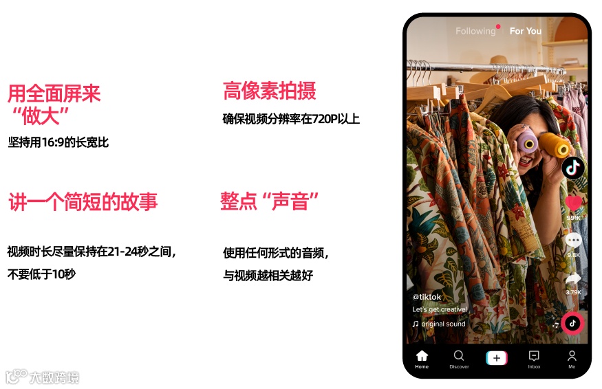 在进入“游戏”之前,先弄清楚游戏规则,是再基础不过的事情。在创作品牌内容的时候,TikTok提供了以下几点基本规则,来帮助品牌更好地创建病毒视频。
