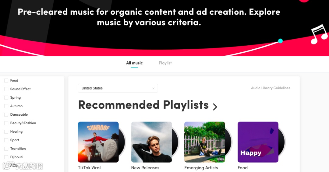 TikTok官方提供可做商业用途使用的音频库,其中按照主题、类型、情绪和年龄层四大维度进行了划分。