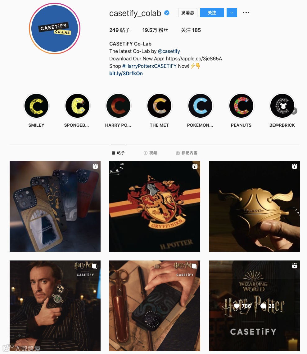 尤其是专门展示和介绍IP联名产品的主页@casetify_colab,拥有19.5万粉丝,同时还有独立的APP,将IP聚合的影响力及粉丝经济发挥到了极致。