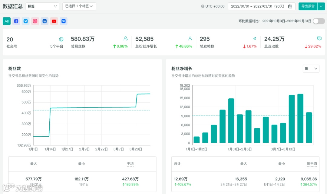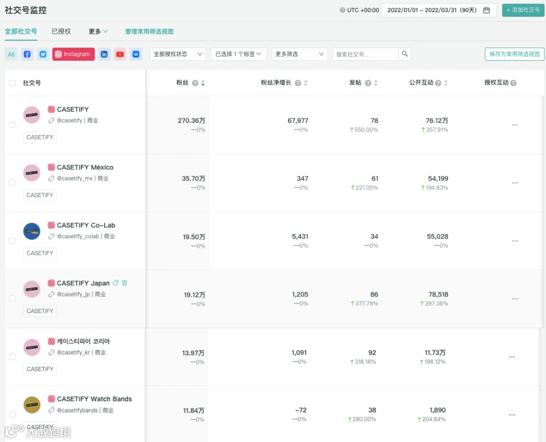 通过OneSight营销云的“数据汇总”功能我们可以将CASETiFY在Facebook、Instagram、Twitter、YouTube和LinkedIn上的主页聚合在一起查看其Q1数据,截至3月31日,CASETiFY在社交媒体上共收获580万+粉丝以及24万+互动。