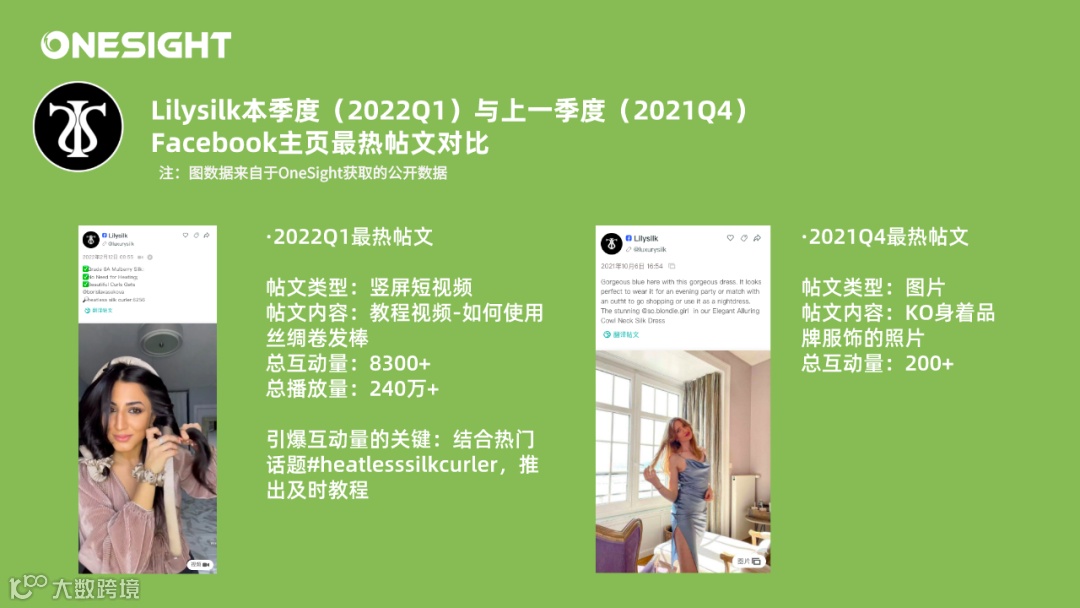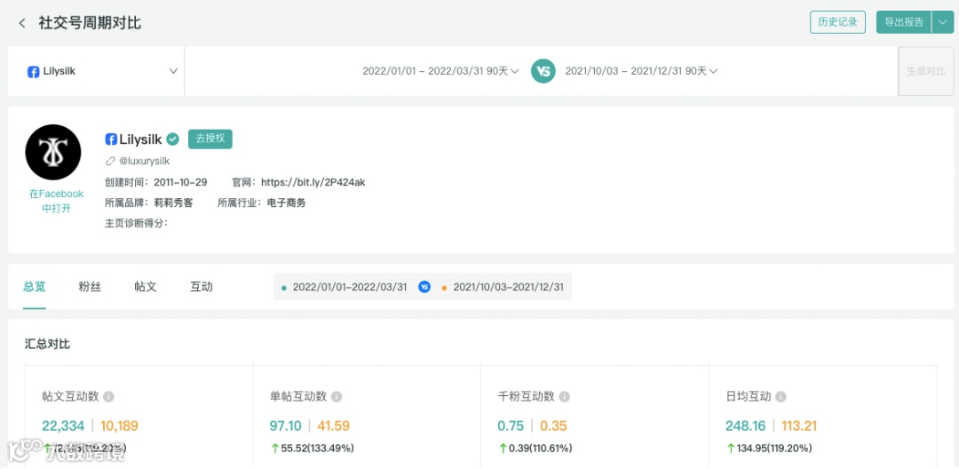 通过OneSight营销云的“周期对比”功能,我们可以将Lilysilk粉丝数最高的Facebook主页的2022Q1季度社交媒体数据与2021Q4相对比。