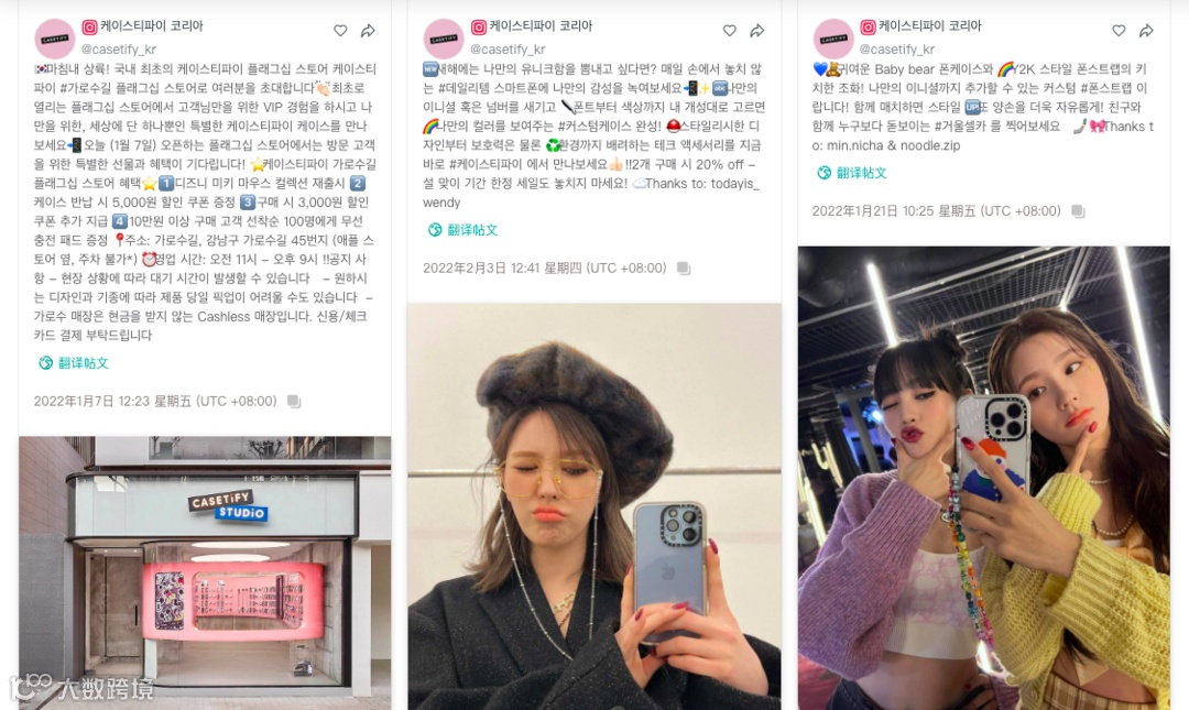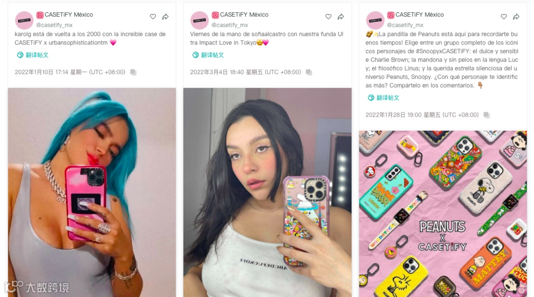 同时,从3个主页的TOP帖文中可以明显看到,面向不同的地区,CASETiFY在图片内容上采用的不同风格:墨西哥多彩大胆、日本优雅时尚、韩国清新活泼。