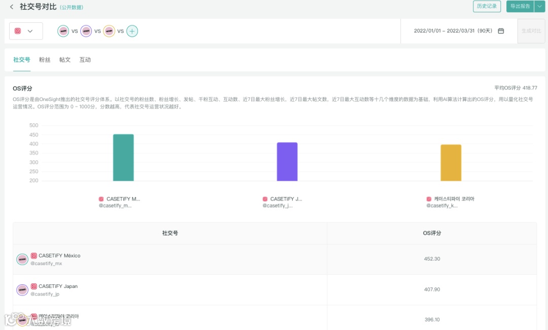 我们将CASETiFY粉丝数超过10万的地区市场主页(墨西哥、日本、韩国)在OneSight后台进行对比可以发现,在细分市场主页的运营上,CASETiFY没有“厚此薄彼”——三个主页的OS评分处于同一水平。