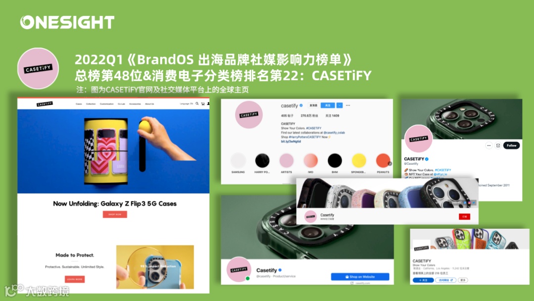 CASETiFY是一家2011年在中国香港成立的手机壳品牌,在此次的《BrandOS TOP100 出海品牌社媒影响力榜单》中首次入榜,在总榜中排名第48,是新上榜品牌中唯二进入TOP50的品牌。同时在消费电子细分榜单中CASETiFY也在一众手机品牌中保持极强的竞争力,位列第22名。