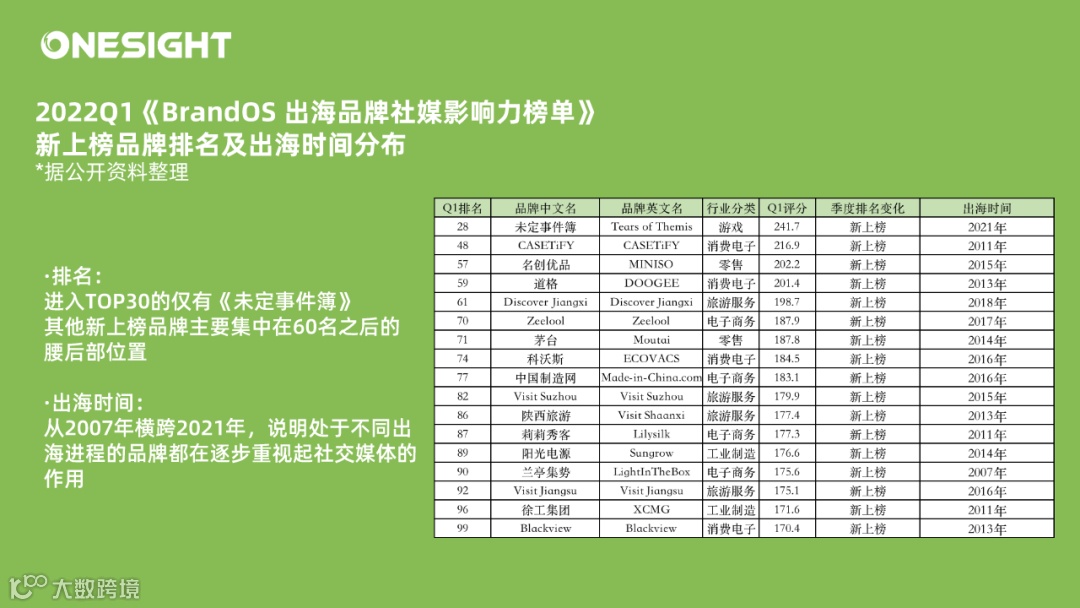 2022Q1《BrandOS TOP100出海品牌社媒影响力榜单》(以下简称“榜单”)已于,我们推出了系列文章对榜单进行解读。本文为系列解读的第二篇,主要聚焦本季度新上榜品牌。