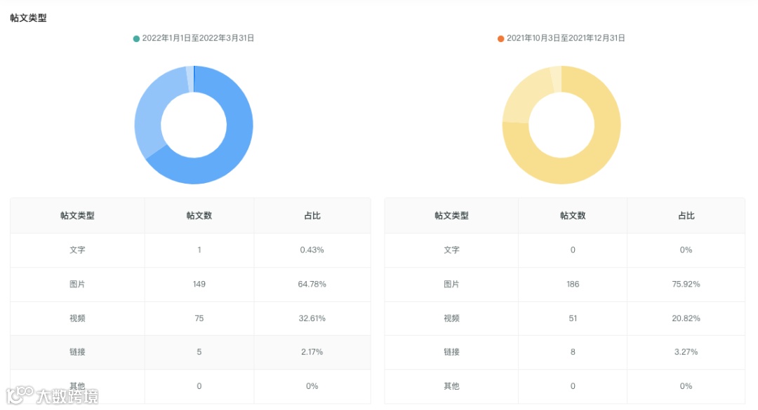 两个季度周期内的帖文类型均以图片类帖文为主,这与服饰、美妆行业整体的内容类型相同。