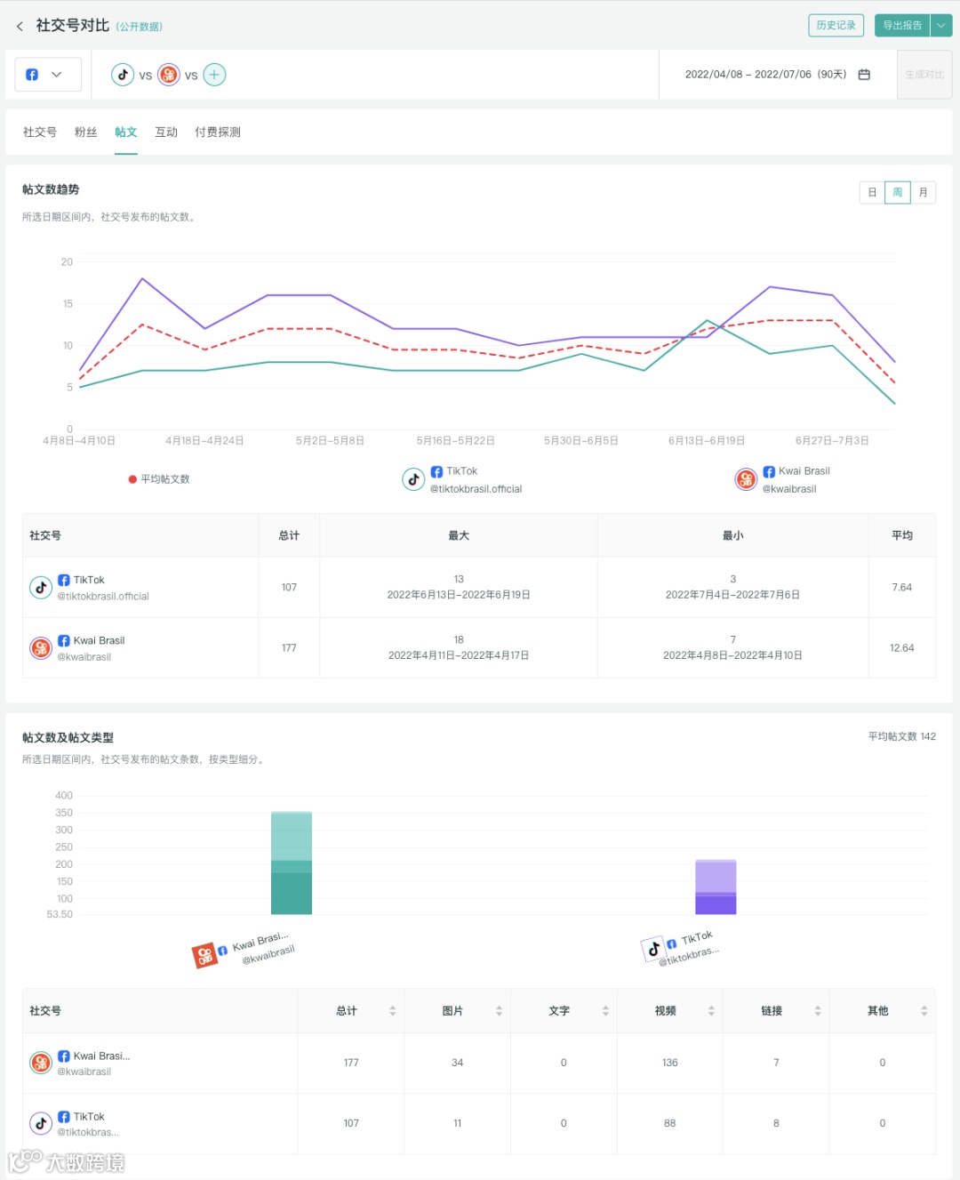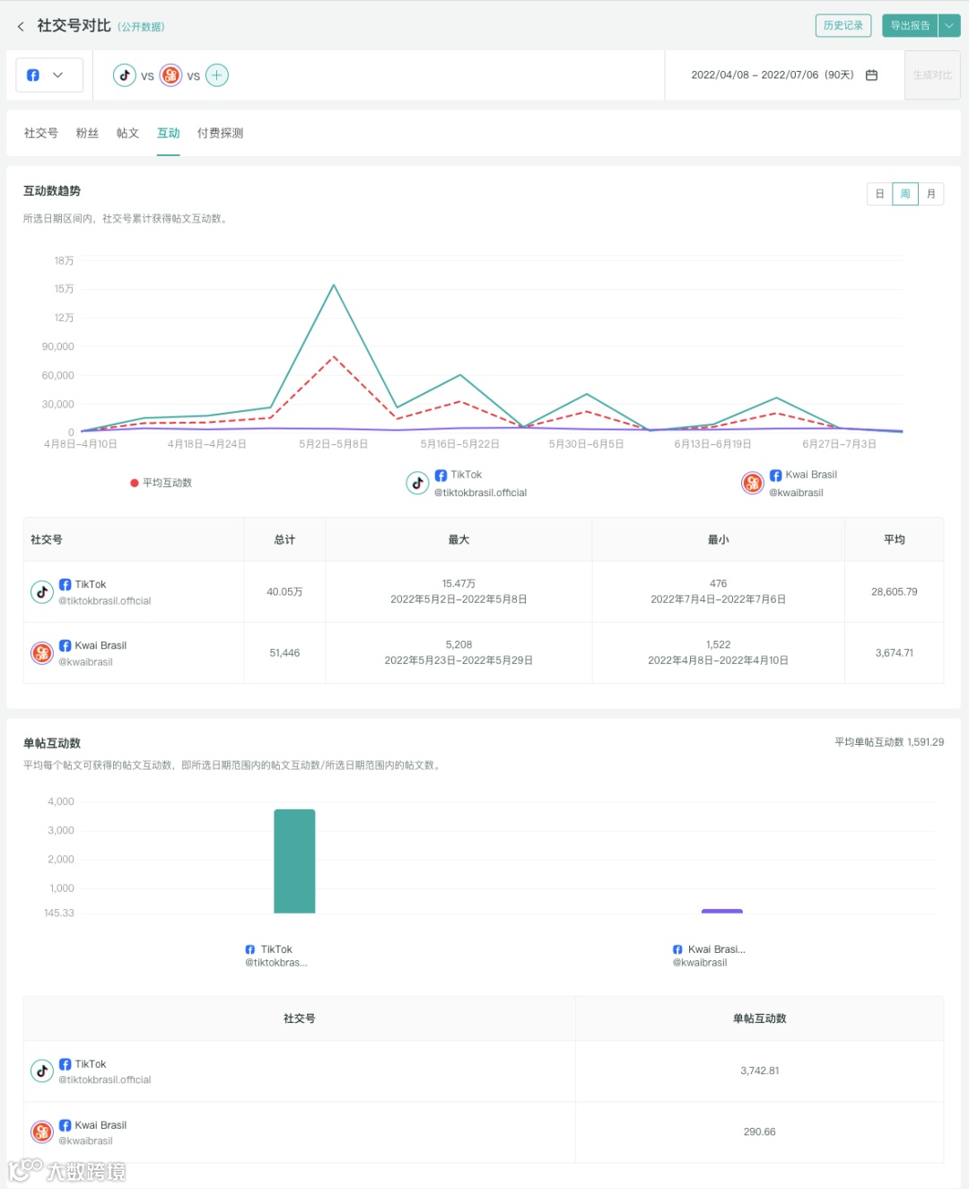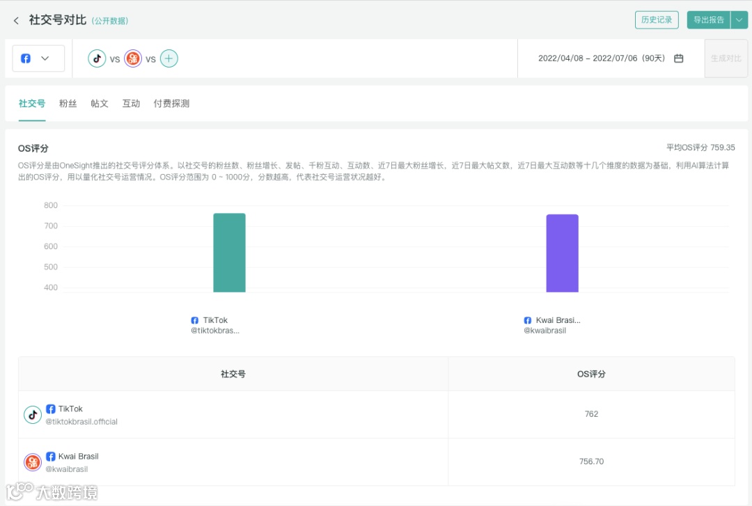 为了增强可比性,我们选取Kwai和TikTok在Facebook巴西主页的数据进行对比,从五个方面分析,包括OS评分、粉丝、帖文、互动、付费探测,选取近90天的数据。