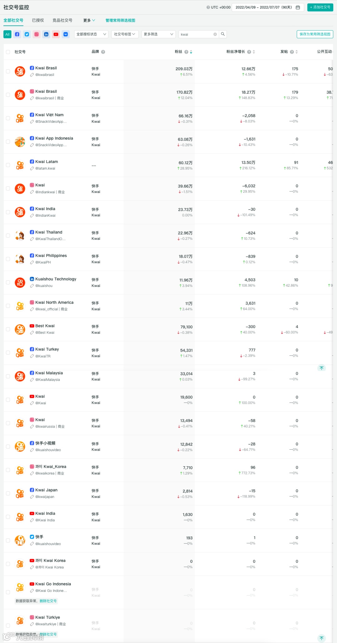 TikTok是抖音的海外品牌,Kwai是快手的海外品牌。从他们在海外社媒平台的主页分布和数据表现,可以看出各自的发展现状。