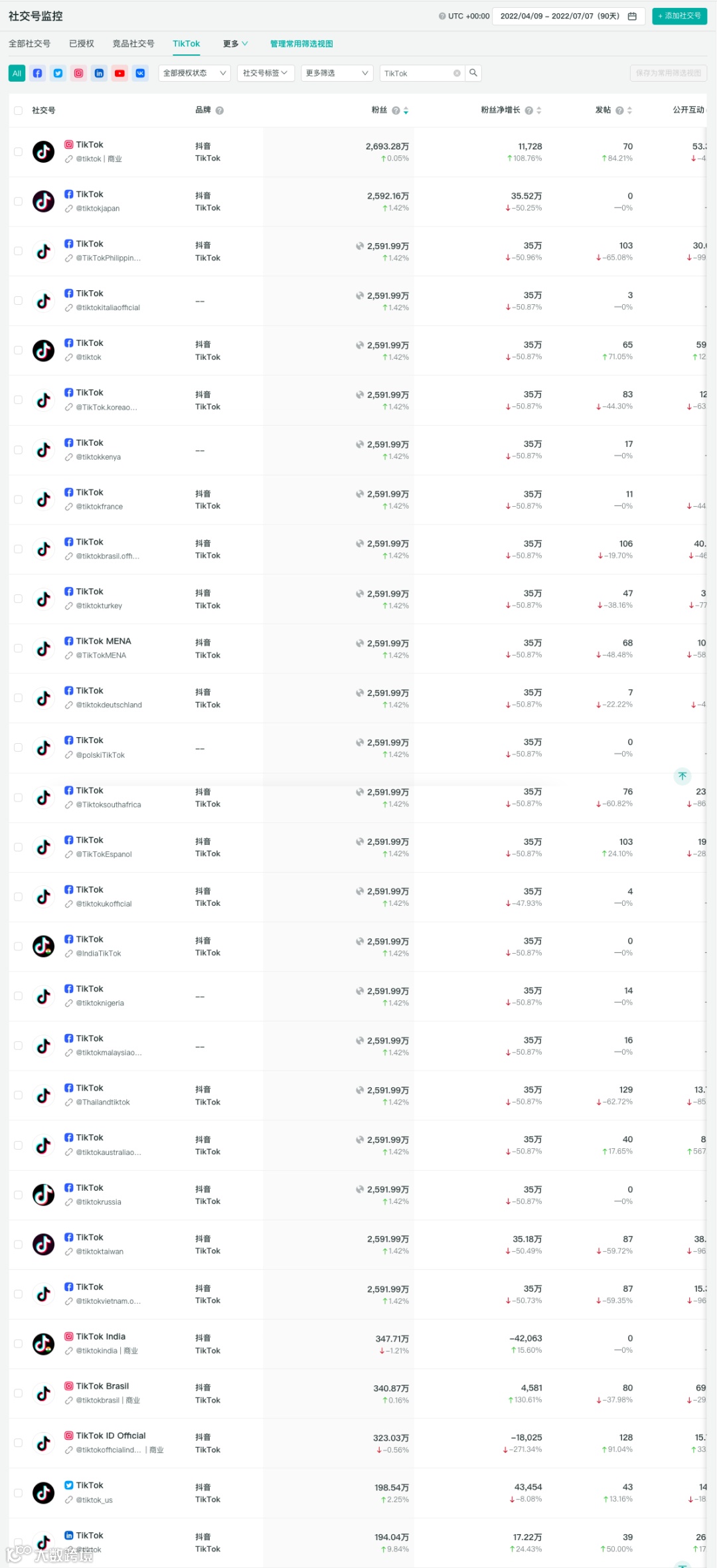 从上图可以看出,TikTok的全球分布广泛,不仅有全球页,还设立了数十个国家或地区的主页,覆盖Facebook、Instagram、Twitter、YouTube、LinkedIn等多个平台。多数主页运营良好,但印度和俄罗斯的主页近90天未更新。