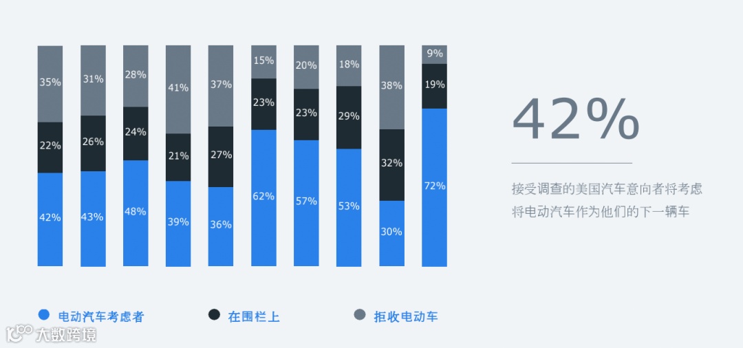 从上图的数据中我们可以看出,在大多数的受调查消费者中,还没有考虑新能源汽车的人数更多。在美国市场,只有42%的受访者考虑采用新能源汽车,22%持观望态度,35%的人则直接拒绝。