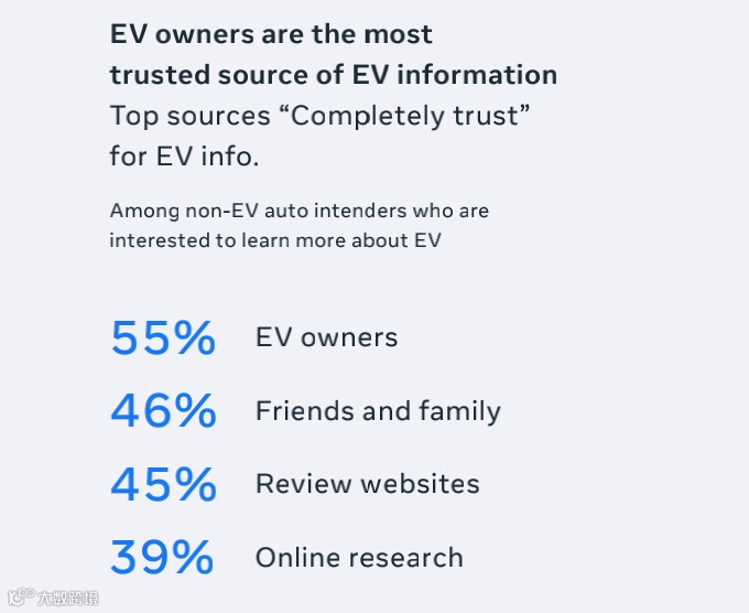 调查显示,最值得信赖的信息来源是现有的新能源汽车车主,55%的受访者表示,他们会完全信任现有的新能源汽车车主;其次是46%的人会信任朋友和家人。