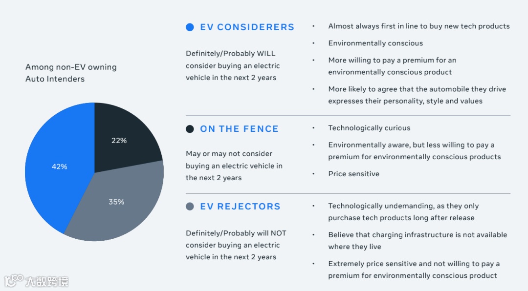 在观望中的消费者是进行新能源汽车市场教育的主要目标用户,而拒绝新能源汽车的用户则需要更多的契机来符合他们的需求。
